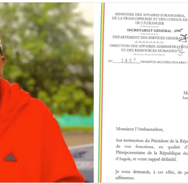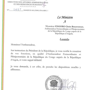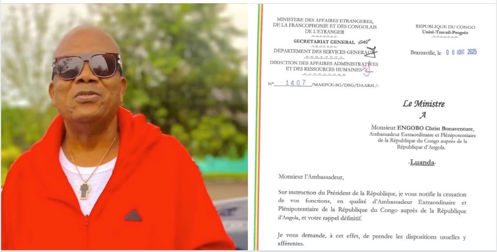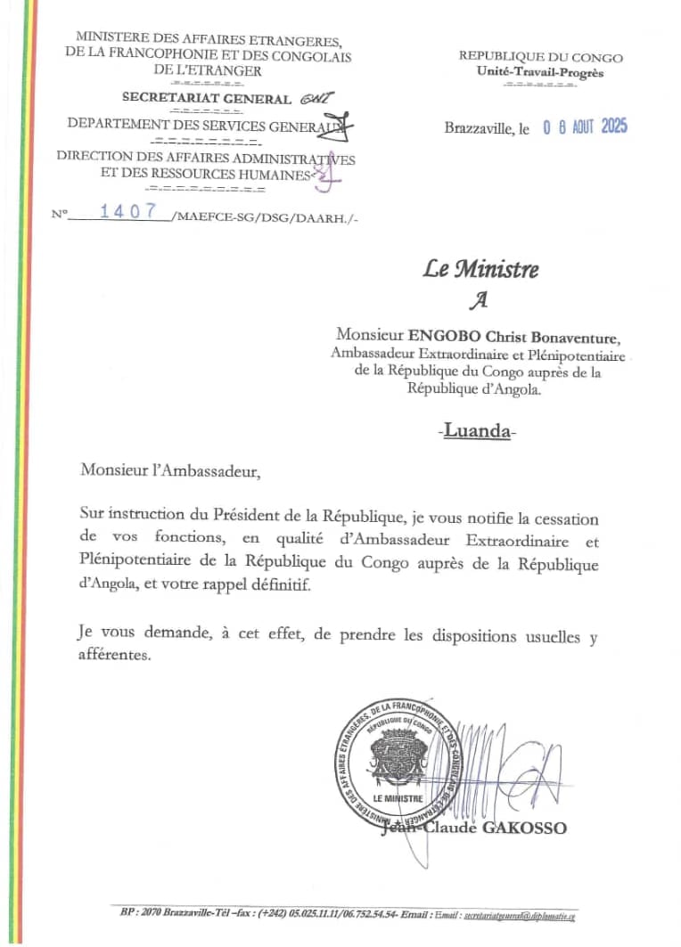 La lettre de rappel définitif de Bonaventure Engobe avait été signé depuis le 08 août 2025 par le ministre des affaires étrangères Jean-Claude Ngakosso. L'ambassadeur Plénipotentiaire et extraordinaire du Congo en Angola est rappelé définitivement sur "instruction du Président de la République" peut-on lire.