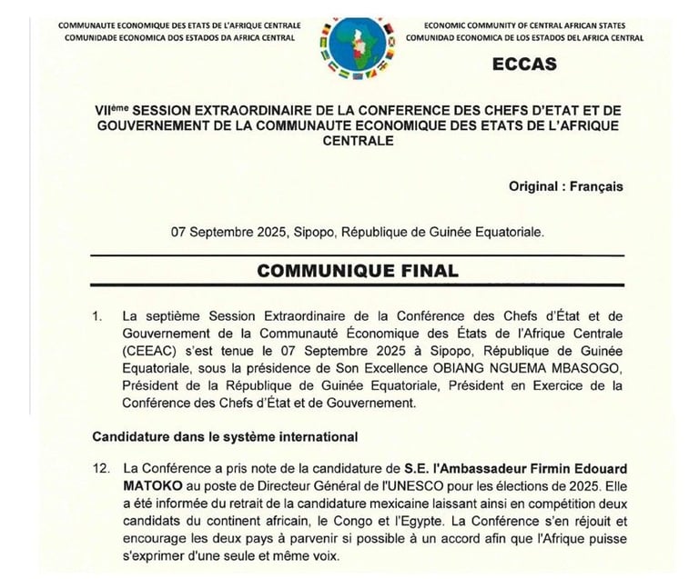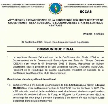 Anatole Collinet Makosso a représenté le président DSN à la VIIᵉ session extraordinaire de la Conférence des Chefs d’État et de Gouvernement de la CEEAC qui s'est tenue à Malabo, le 07 septembre 2025. La délégation congolaise espérait rentrer à Brazzaville avec le soutien des pays membres de la sous région, pour la candidature de Firmin Matoko, présentée par le Congo au poste de Directeur Général de l'UNESCO.